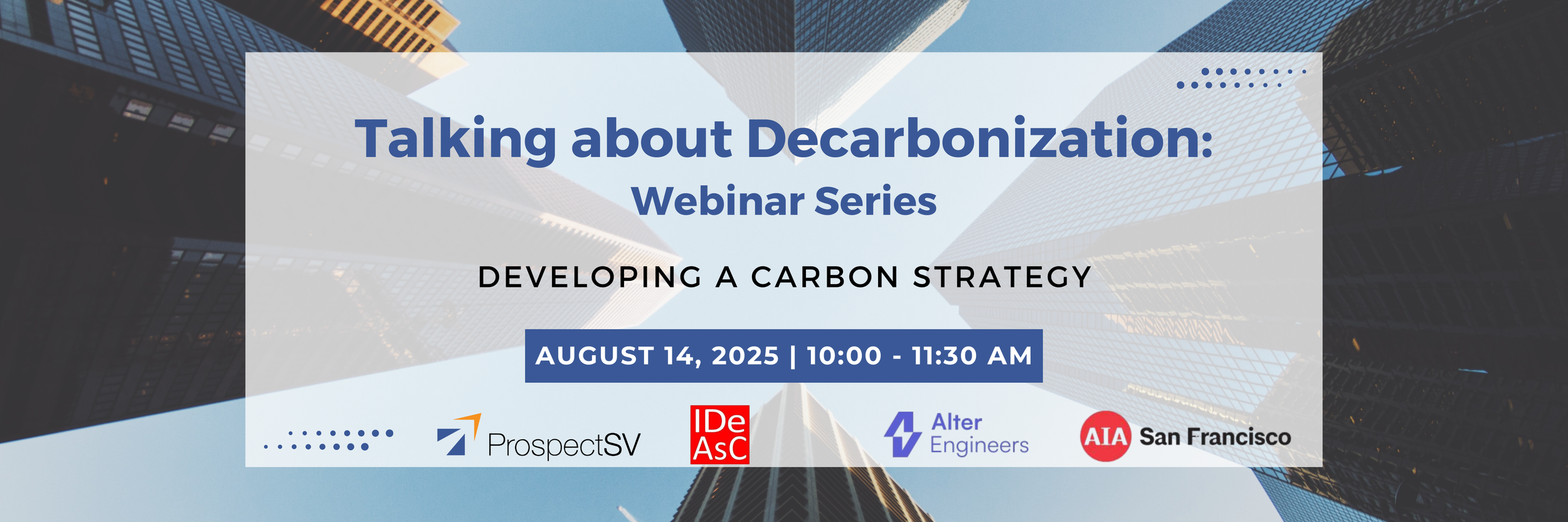 ProspectSV, IdeAs Consulting Inc, Alter Engineers, and AIASF COTE has an ongoing webinar series on Talking about Decarbonization. We discussed current decarbonization trends, how to communicate sustainability ideas to various clients, and how to apply these new strategies to a project. This session covered how to address various constraints, set goals early, and assess options to lock in good ideas. The panelists shared success stories from case studies and general advice on incorporating decarbonization design practice and strategies from their experience in the field. Presentation qualified for 1-hour HSW AIA Continuing Education.