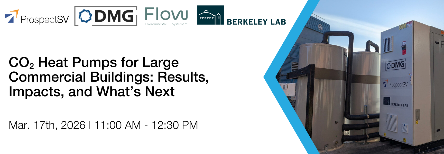 In 2024, ProspectSV launched a California Energy Commission (CEC) funded technology demonstration at Lawrence Berkeley National Lab’s FLEXLAB testing facility, showcasing Flow Environmental Systems’ innovative all-electric CO₂ heat pump capable of providing simultaneous heating, cooling, and domestic hot water. In this webinar, you will hear from the Project Team, including Adam Jue (ProspectSV), Rongxin Yin (Lawrence Berkeley National Lab), Isaac Simpson (DMG), and Sean Jarvie (Flow Environmental Systems), as they share results from the demonstration, CO2 applications in other building types, resources that will support wider adoption of this technology, and what this demonstration means for the building industry. Participants will leave with a clearer understanding of how CO2 heat pumps can be applied to commercial buildings, new resources and training available to the buildings industry, and how this demonstration sets the stage for what comes next.